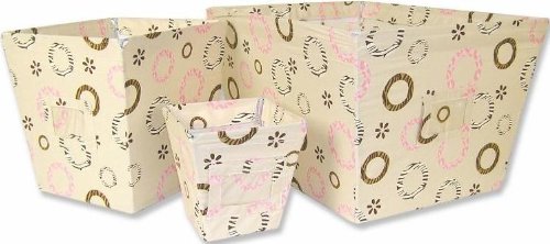 Sweet Safari Pink print large fabric storage measures 18" x 14" x 10." Medium measures 10" x 10" x 10." Small measures 6" x 6" x 6." Storage bins have label window and removable fabric liner for easy laundering. 3 pc set includes small- 6" x 6" x 6", medium 10" x 10" x 10", large 18"x 14" x 10" all with label window. All fabric liners remove for easylaundering.